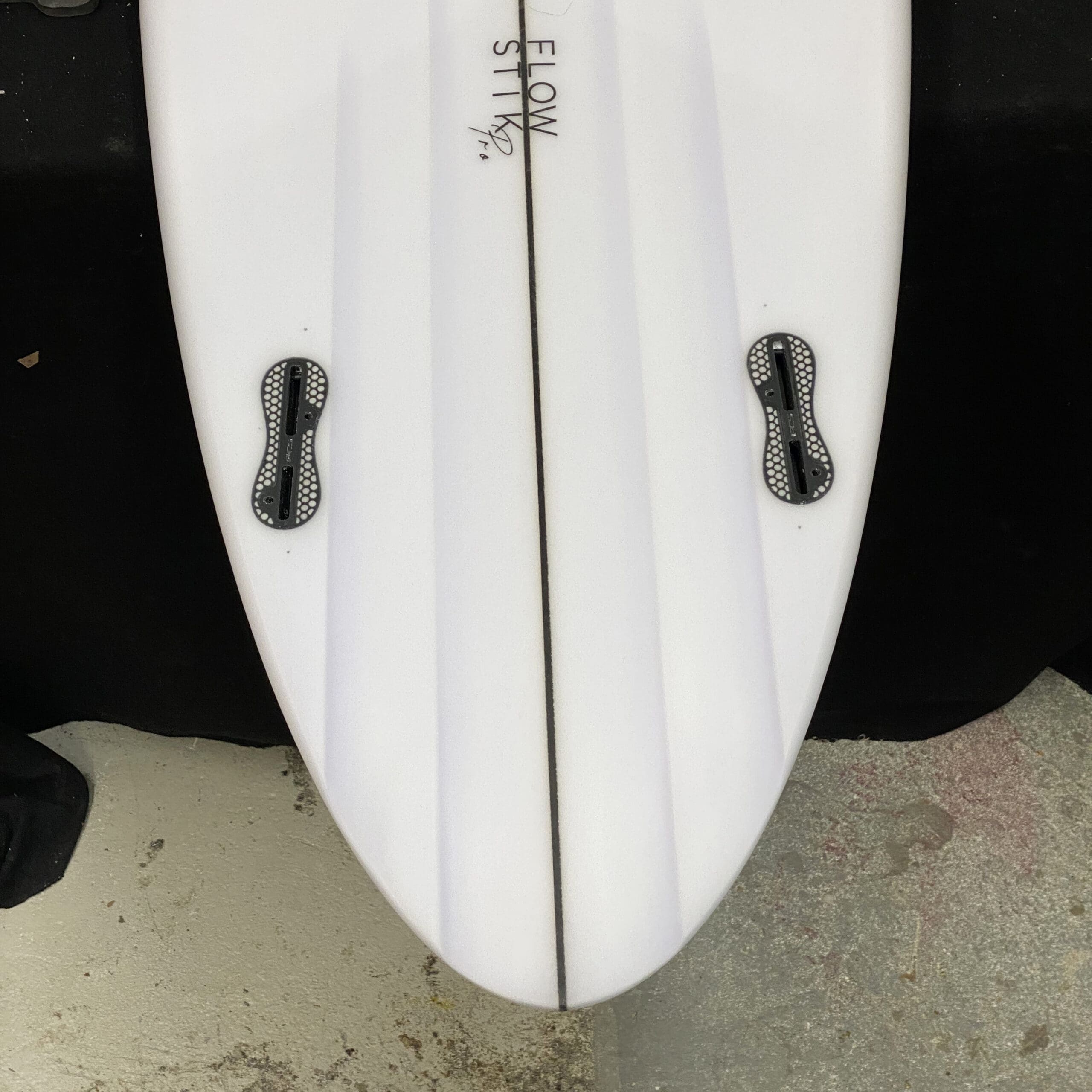 The FLOW STIK Pro is designed to go fast, real fast and carve hard! Ride it as a twin or single fin. The channel bottom creates lift at speed and adds hold on rail, allowing the rider at speed to relax and add a little more style to their game. Alan loves the FCS Power Twins in this board, saying that in larger surf it just carves and feels like “I’m snowboarding on water, plus in the tube it absolutely flies!” For those single fin cruisers out there we recommend using a 6.0 FCS Connect single fin.